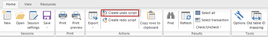 在主页的tab窗口里的Actions 组里去点击“Create undo 脚本 ”来创建所有在grid窗格里显示的事务undo 脚本。检查您想创建的 Undo 脚本里的事务,在主grid窗格里右击并在邮件菜单里点击“创建undo脚本” 来创建已经被选中的事务的Undo 脚本