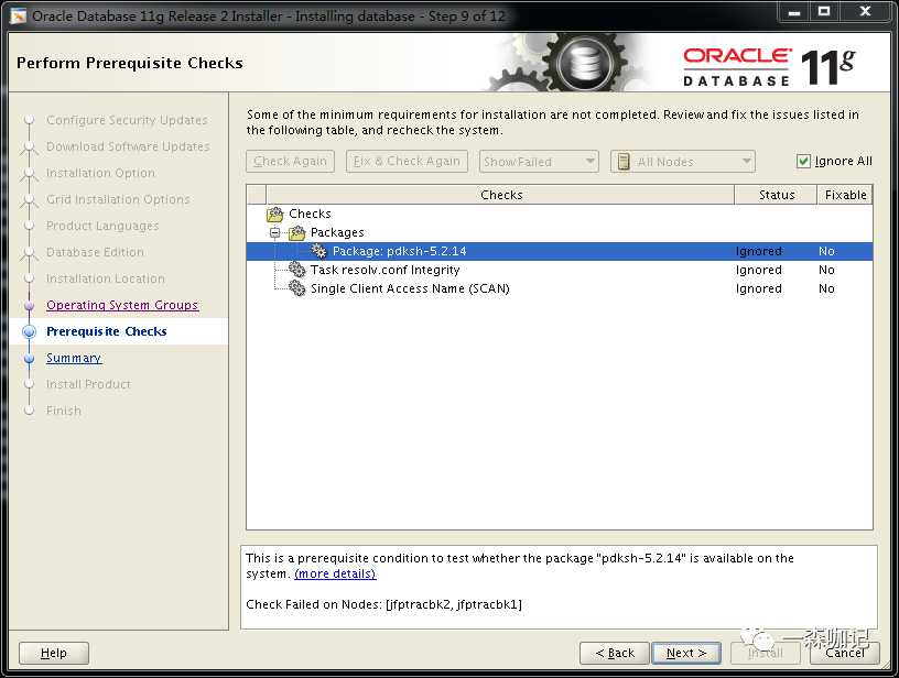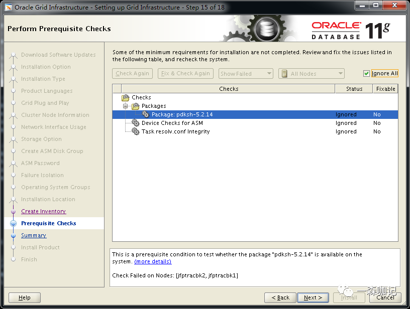 2. 安装grid时,检查到缺少pdksh-5.2.14,RHEL7使用ksh,可以忽略此信息。