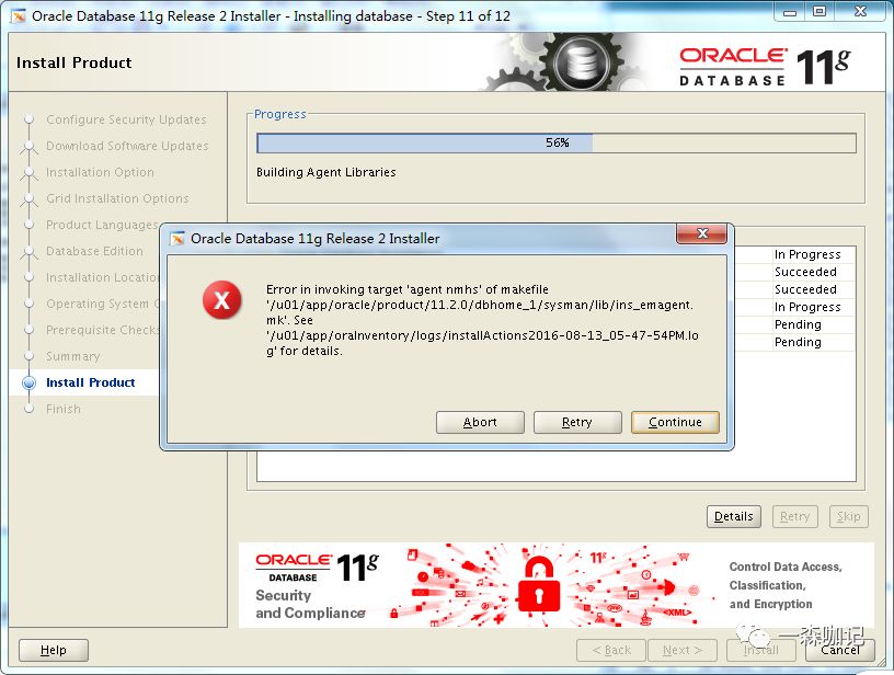 将ins_emagent.mk文件中的$(MK_EMAGENT_NMECTL)更改为$(MK_EMAGENT_NMECTL) -lnnz11,然后在安装过程中点击Retry即可。