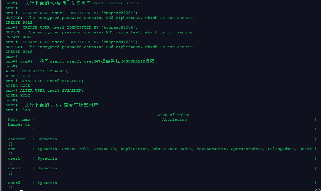 1.创建用户user1、user2、user3,授予user1、user2、user3数据库系统的SYSADMIN权限