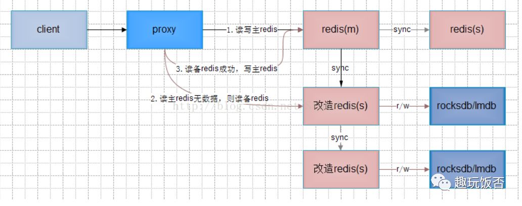 1) 写操作时proxy正常写主redis,由改造备redis写rocksdb;