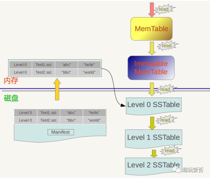 磁盘数据存储文件。分为Level 0到Level N多层,每一层包含多个SST文件;单个SST文件容量随层次增加成倍增长;文件内数据有序;其中Level 0的SST文件由Immutable直接Dump产生,其他Level的SST文件由其上一层的文件和本层文件归并产生;SST文件在归并过程中顺序写生成,生成后仅可能在之后的归并中被删除,而不会有任何的修改操作。