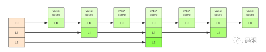 跳跃列表就是类似于这种层级制,最下面一层所有的元素都会串起来。然后每隔几个元素挑选出一个代表来,再将这几个代表使用另外一级指针串起来。然后在这些代表里再挑出二级代表,再串起来。最终就形成了金字塔结构。