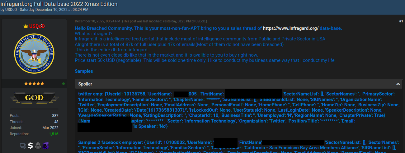 2022 年 12 月 10 日,相对较新的网络犯罪论坛Breached推出了一个重磅炸弹的新销售线程:InfraGard 的用户数据库,包括数万名 InfraGard 成员的姓名和联系信息。