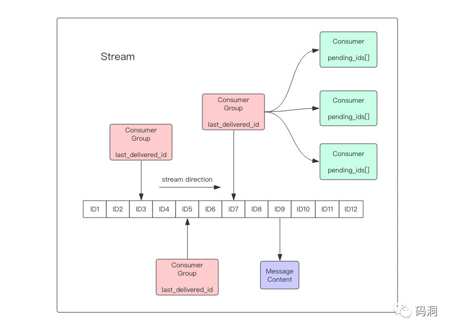 在Stream数组之上往前移动,表示当前消费组已经消费到哪条消息了。每个消费组都有一个Stream内唯一的名称,消费组不会自动创建,它需要单独的指令xgroup create