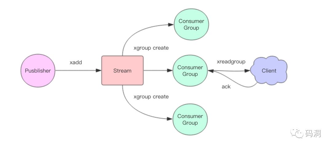 127.0.0.1:6379> xinfo groups codehole # 获取Stream的消费组信息