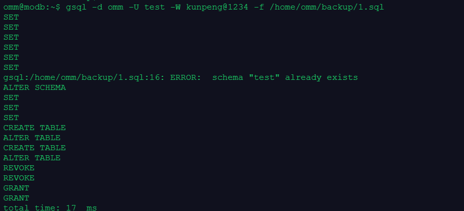 gsql -d omm -U test -W kunpeng@1234 -f /home/omm/backup/1.sql
