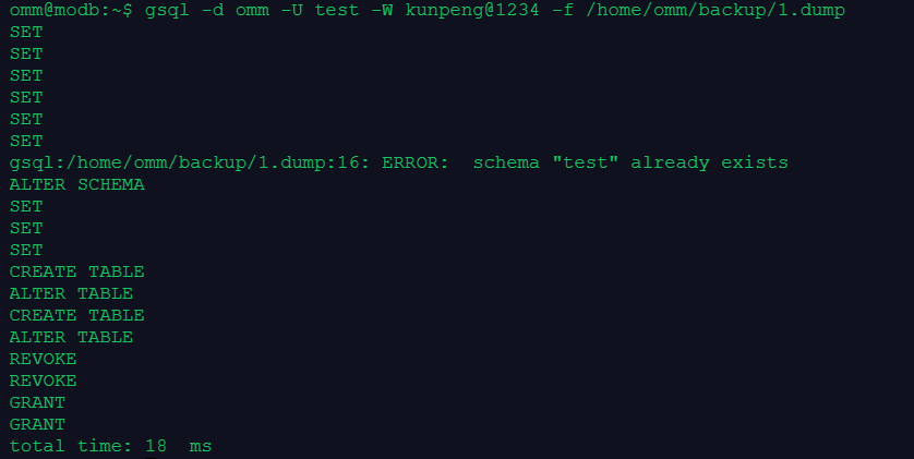 gsql -d omm -U test -W kunpeng@1234 -f /home/omm/backup/1.dump
