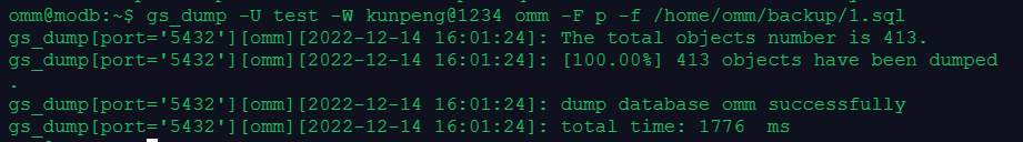 gs_dump -U test -W kunpeng@1234 omm -F p -f /home/omm/backup/1.dump
