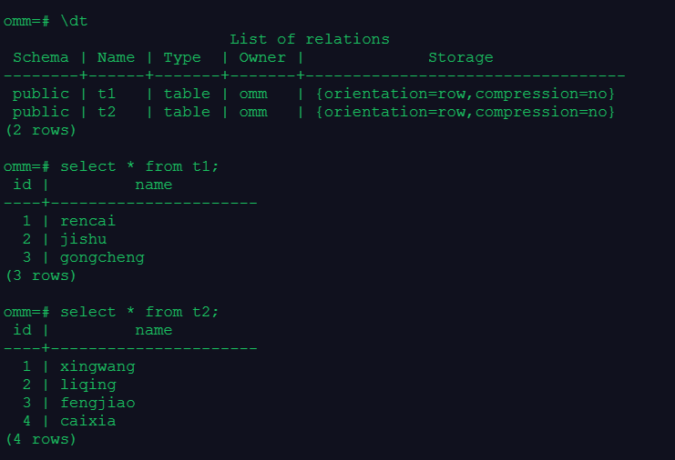 insert into t2 values(1,'xingwang'),(2,'liqing'),(3,'fengjiao'),(4,'caixia');1、逻辑备份和恢复案例1:使用sql格式进行备份和恢复omm数据库