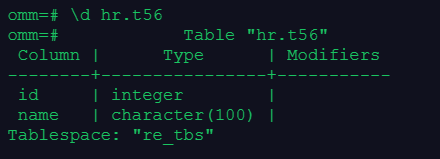 create table hr.t56(id int,name char(100)) tablespace re_tbs;