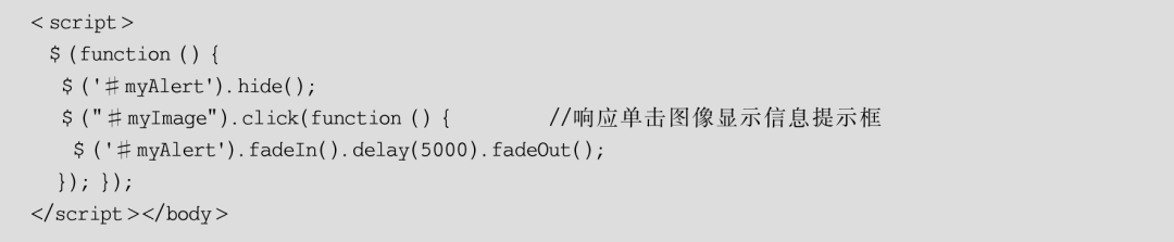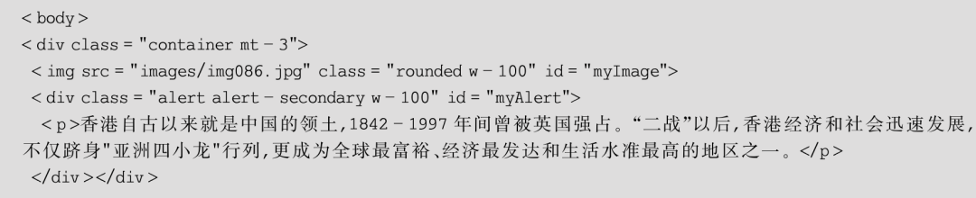 在上面这段代码中,fadeIn()表示以淡入的风格显示信息提示框。delay(5000)表示延时5秒。fadeOut()表示以淡出的风格关闭信息提示框。class="alert alert-secondary w-100"表示创建灰色背景的信息提示框,除了alert-secondary类之外,还可以使用下列类设置信息提示框的背景:alert-success(绿色)、alert-info(青色)、alert-warning(黄色)、alert-danger(红色)、alert-primary(蓝色)、alert-light(浅色) 或alert-dark(深色)。