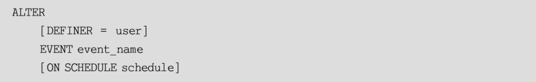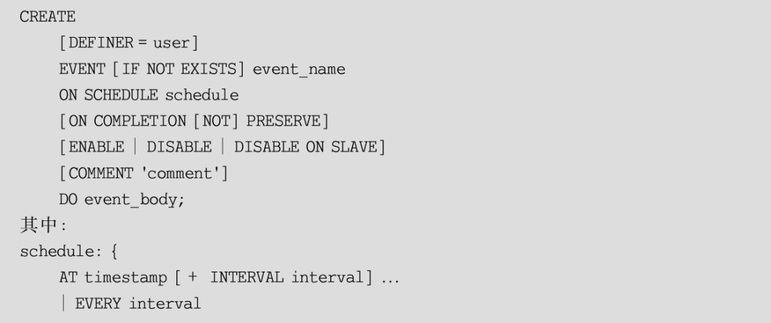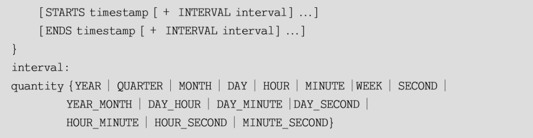 ON SCHEDULE schedule表示触发点,用于定义执行的时间和时间间隔,包括2种选项:AT timestamp一般只执行一次,INTERVAL关键字可以用于计算时间间隔,可以直接与日期、时间进行计算;EVERY interval一般周期性执行,STARTS timestamp是可选项,用于设定开始时间,ENDS timestamp是可选选项,用于设定结束时间。