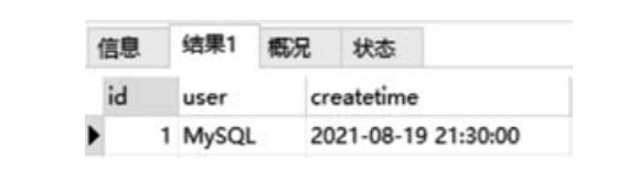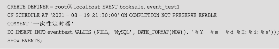 【例9-24】在图书销售数据库booksale中建立事件event_test1,该事件注释为一次性定时器,设定在2021-08-19 21:30:00将系统时间以字符串的形式插入已经存在的eventtest表中,该表的结构为(id,user, createtime),并验证事件执行的结果。
