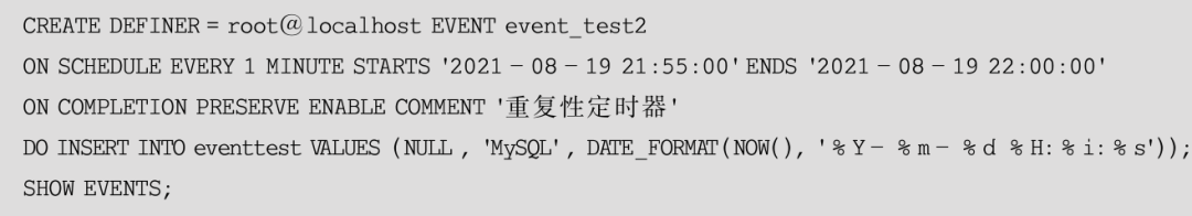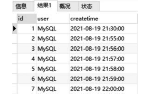 【例9-25】在图书销售数据库booksale中建立事件event_test2,该事件为重复性定时器,设定在2021-08-19 21:55:00到2021-08-19 22:00:00每隔1分钟,将系统时间以字符串的形式插入已经存在的eventtest表中,该表的结构为(id,user, createtime),并验证事件执行的结果。