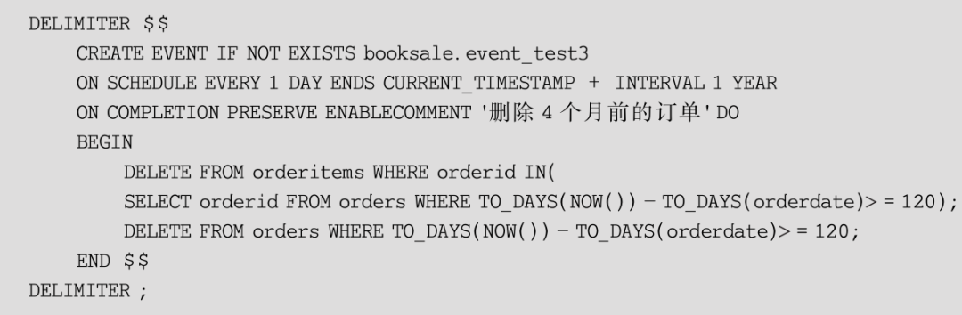 【例9-26】在图书销售数据库booksale中建立事件event_test3,该事件为重复性定时器,从现在开始的一年内每天删除订单表orders中订购日期大于120天的订单,订单项目表orderitems中的相关联记录同步删除,并验证事件执行的结果。