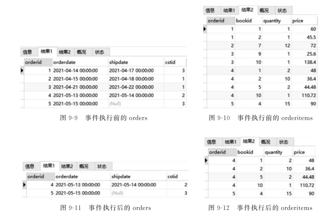 事件执行前订单表orders和订单项目表orderitems中的记录如图9-9和图9-10所示。事件执行后订单表orders和订单项目表orderitems中的记录如图9-11和图9-12所示。