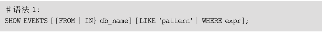 LIKE 'pattern' | WHERE expr是可选选项。LIKE 'pattern'中pattern是匹配字符串,省略时表示查看所有事件,可使用LIKE结合通配符查看部分事件的值,也可直接写事件名;WHERE expr用于指定查看事件的条件。