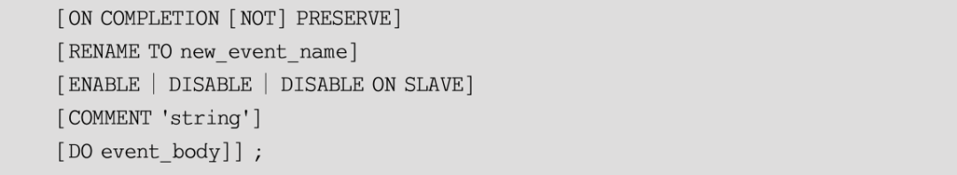 ENABLE | DISABLE | DISABLE ON SLAVE是可选选项,用于指定事件的属性,包括3种选项:ENABLE表示该事件创建以后是开启的,也就是系统将执行这个事件,为默认选项;DISABLE表示该事件创建以后是关闭的,也就是事件的声明存储到目录中,但是不执行这个事件;DISABLE ON SLAVE表示事件在从机中是关闭的。一般用不上,只有设置了MySQL主从数据库才会用得上,指该事件已在主服务器上创建并复制到从属服务器,但在从属服务器上是关闭的。