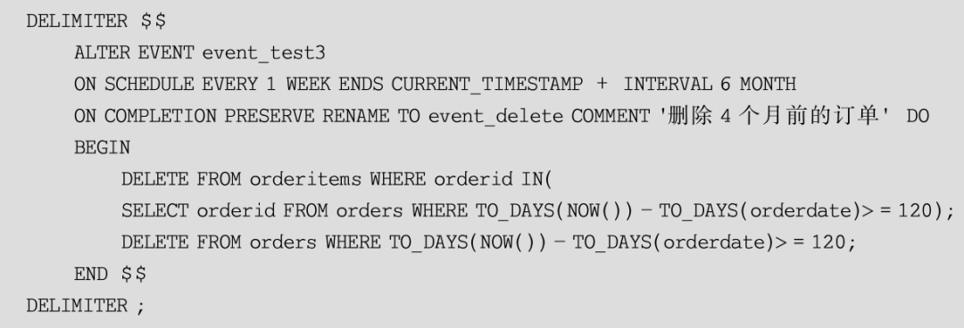 【例9-30】修改图书销售数据库booksale中名为event_test3的事件,将其改名为event_delete,时间频率改为1周,结束时间改为半年。