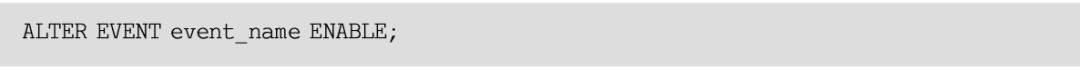 语法说明:event_name是启用事件的名称。事件默认属于当前数据库,也可使用db_name.event_name启用指定数据库中的事件。