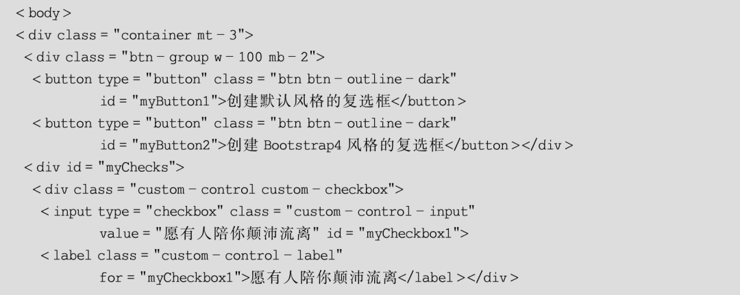此实例主要通过使用custom-control、custom-checkbox、custom-control-input、custom-control-label等类,创建Bootstrap4风格的复选框。当在浏览器中显示页面时,单击“创建默认风格的复选框”按钮,则默认风格的复选框效果如图1所示。