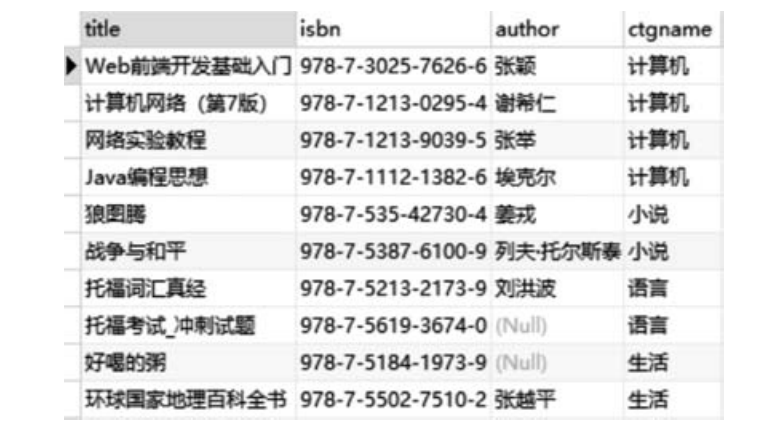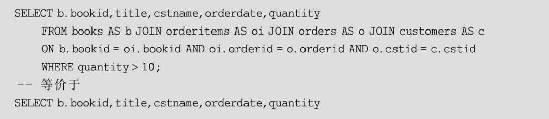 输出的列如果是两个表中都有的列,则必须在输出的列名前加上表名进行区分,用“表名.列名”,如上面命令中的b.bookid;其他输出列都是表中不重复的列,所以直接写列名即可。多表连接时,先将两表连接成一张表,再拿连接成的这张表和下一张表连接,以此类推。