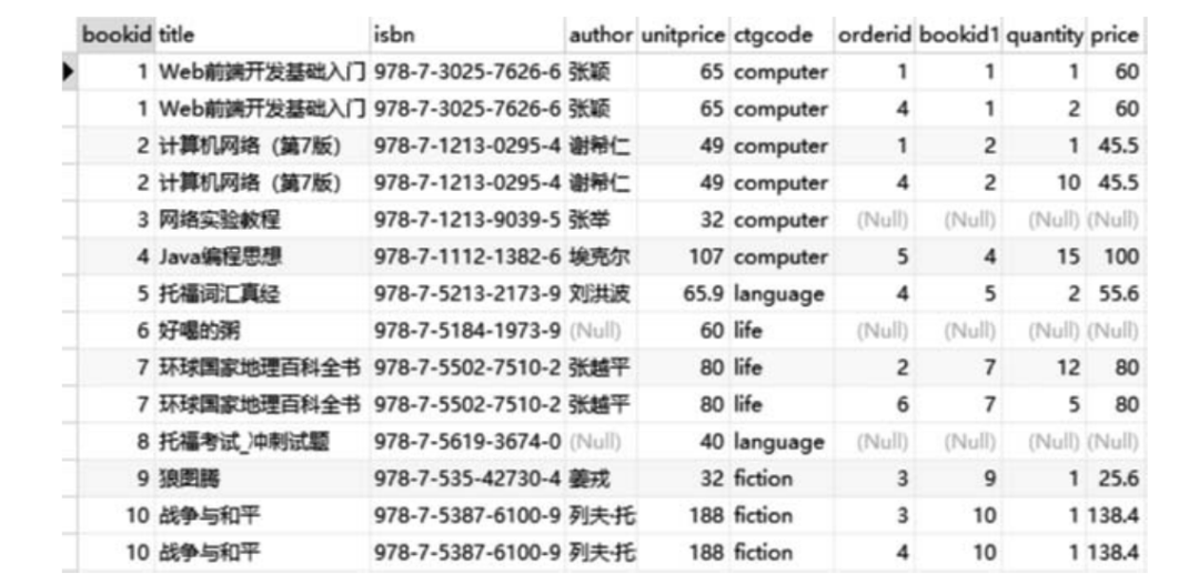 这个查询为左外连接查询。books是左边的表,所以books表中所有记录都会显示,orderitems是右边的表,当没有匹配内容时显示空值NULL。