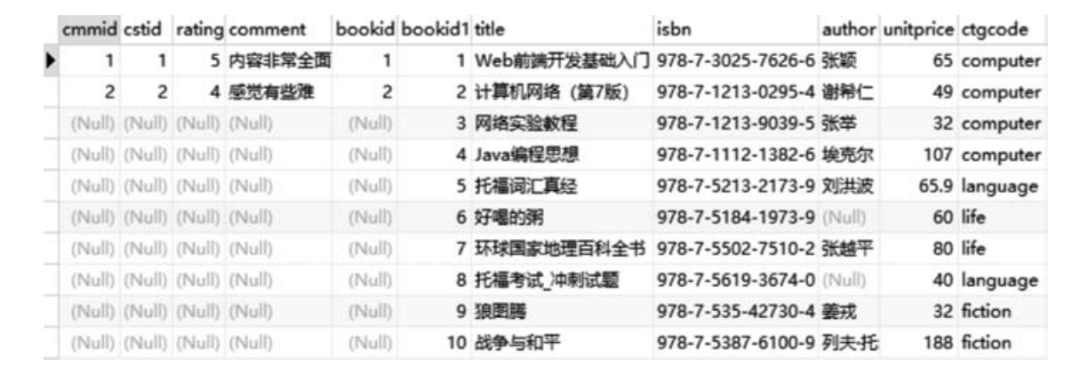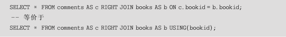 这个查询为右外连接查询。books是右边的表,所以books表中所有记录都会显示,comments是左边的表,当没有匹配内容时显示空值NULL。