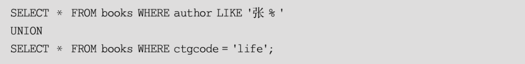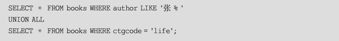 【例7-47】在图书销售数据库booksale中将图书表books中姓“张”的作者出版的图书和生活类图书信息合并显示。