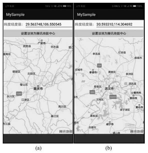 当实例运行之后,如果在“纬度经度值:”输入框中输入重庆的纬度和经度值“29.563748, 106.550545”,然后单击“设置该地为腾讯地图中心”按钮,将设置重庆为腾讯地图的中心,效果如图1(a)所示。如果在“纬度经度值:”输入框中输入武汉的纬度和经度值“30.593310,114.304692”,然后单击“设置该地为腾讯地图中心”按钮,将设置武汉为腾讯地图的中心,效果如图1(b)所示。