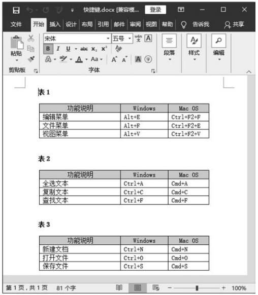 此案例主要通过使用Document的tables属性,从而实现在Word文件中获取指定的表格,并使用remove()方法删除该表格。当运行此案例的Python代码(B081.py文件)之后,将删除“快捷键.docx”文件的第2个表格,代码运行前后的效果分别如图3和图4所示。