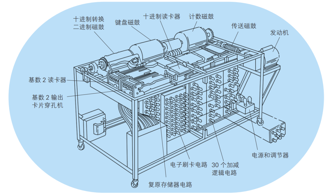 ABC 的全称是“阿塔纳索夫-贝瑞计算机”(Atanasoff-Berry Computer),其构造如图6所示。其中阿塔纳索夫(Atanasoff)和贝瑞(Berry)是它的两位发明者的姓氏。