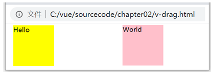 在v-drag.html页面上有两个不同颜色的方框,分别对应两个<div>元素: