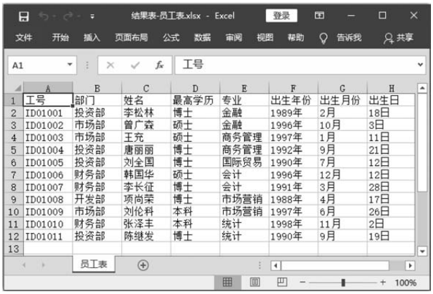 此案例主要通过使用Python语言的字符串的find()方法,从而实现在工作表中根据指定的不同字符(如'年'、'月'、'日'等)将一列的数据(如'1989年2月18日')拆分到多(三)列中。当运行此案例的Python代码(A320.py文件)之后,将把“员工表.xlsx”文件的员工表的出生日期列拆分为出生年份列、出生月份列、出生日列,代码运行前后的效果分别如图3和图4所示。