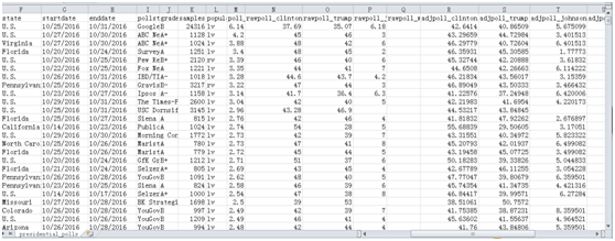 本案例使用的数据集包含了从2015年11月到2016年11月美国总统大选的民意调查选票数据。该数据集由27列不同类型的数据组成,保存为一个CSV文件,如图6-1所示。此数据集来源于kaggle网站,网址为:https://www.kaggle.com/fivethirtyeight/2016-election-polls。
