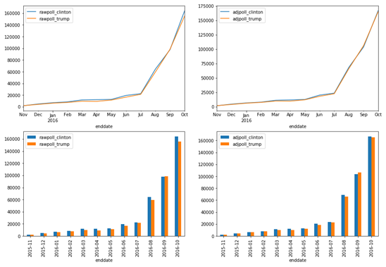 import datetimeimport pandas as pdimport matplotlib.pyplot as pltdf_data = pd.read_csv('/home/aistudio/data/data76670/presidential_polls.csv') # 加载数据## step 1 标准化数据df_data['enddate']=pd.to_datetime(df_data['enddate'])df_data["enddate"]=df_data["enddate"].dt.to_period("M")## step 2 数据可视化fig,axes = plt.subplots(nrows=2, ncols=2,figsize=(15,10))grouped_rawdata = df_data.groupby(df_data["enddate"])['rawpoll_clinton','rawpoll_trump'].sum()# 原始数据趋势展示grouped_adjdata = df_data.groupby(df_data["enddate"])['adjpoll_clinton','adjpoll_trump'].sum()# 调整后数据显示grouped_rawdata.plot(ax=axes[0,0])grouped_adjdata.plot(ax=axes[0,1])grouped_rawdata.plot(kind='bar',ax=axes[1, 0])grouped_adjdata.plot(kind='bar',ax=axes[1, 1])plt.show()