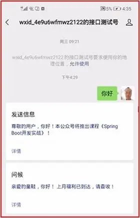 在手机微信公众号中输入文本(如“你好”),公众号发送两条模板消息,如下图所示。