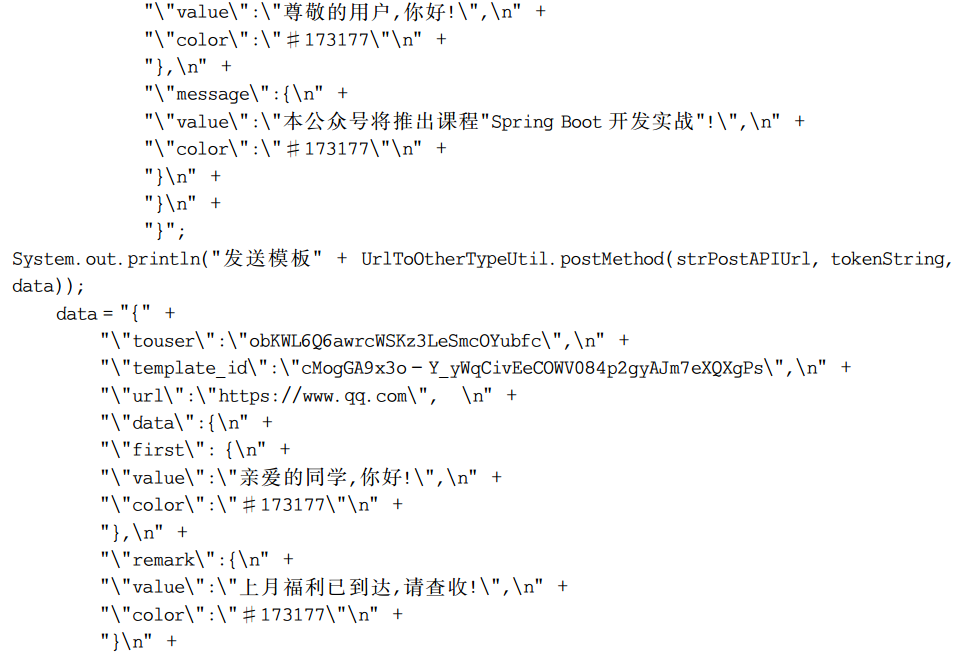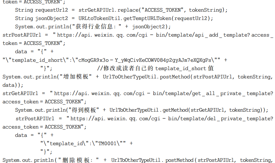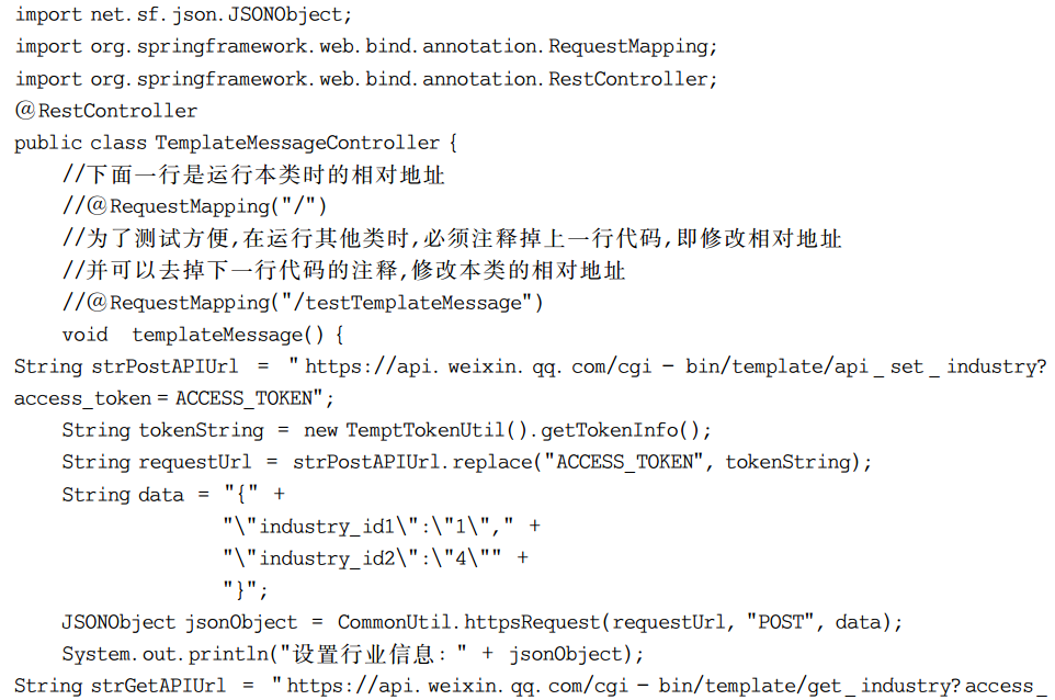 在包edu.bookcode.controller中创建类TemplateMessageController,代码如例6-2所示。请读者可将例6-2代码中的模板ID修改成自己的模板ID(如图6-1所示)。