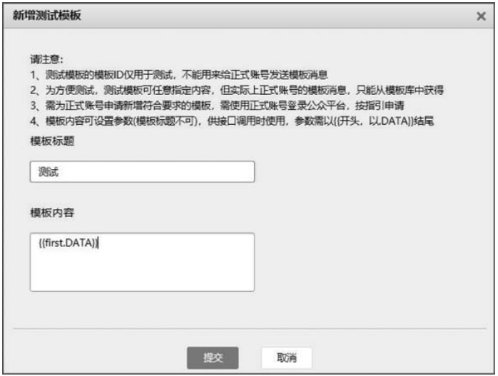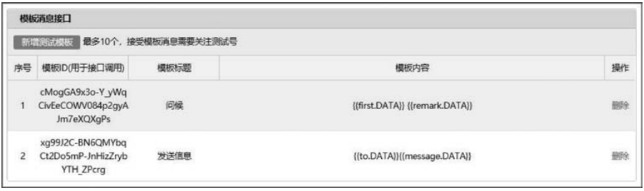 登录微信公众号管理后台,可以新增模板(由于是测试号,因此是测试模板),已有模板如图6-1所示。在没有增加模板之前,图6-1对应的模板为空(图6-1是新增2个模板之后的结果)。单击图6-1在“新增测试模板”按钮后,弹出如图6-2所示的对话框,可以按照规范填写模板标题和内容。