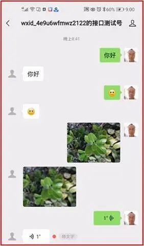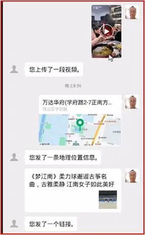 在手机微信公众号中输入文本(如“你好”和微笑表情)、发送图片(预先准备好的图片)、发送语音(直接采用微信的语音功能)、发送视频(预先准备好的视频)、发送地理位置(手机当前所在的位置)、发送链接预先准备好的链接)等消息,手机上的结果如下图所示(上下屏滑动显示)。