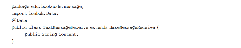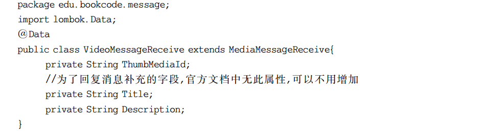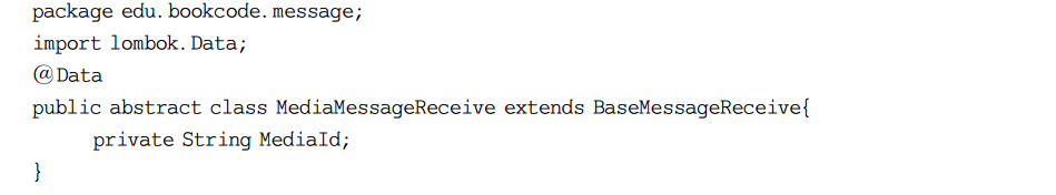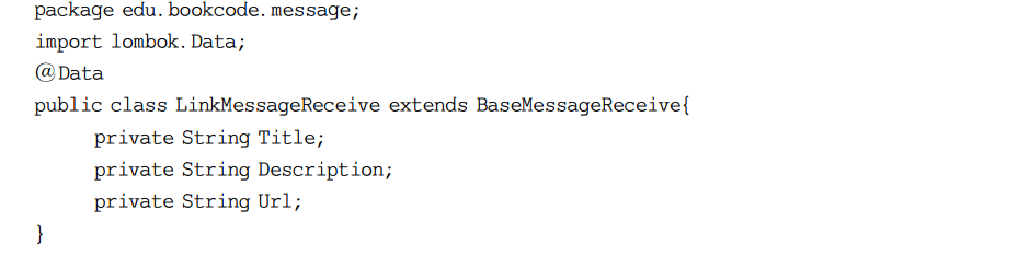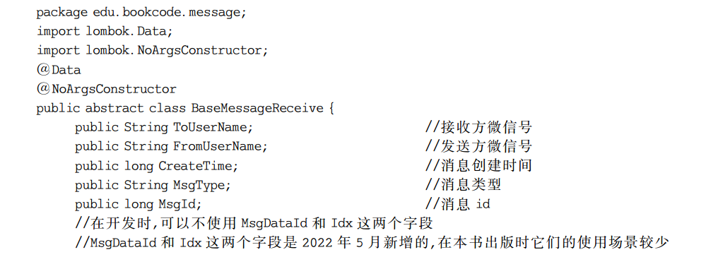 在包edu.bookcode中创建message子包,并在包edu.bookcode.message中创建类BaseMessageReceive,该类中的属性代表了所有收到消息的相同字段,代码如例4-12所示。