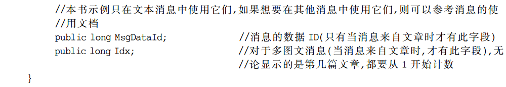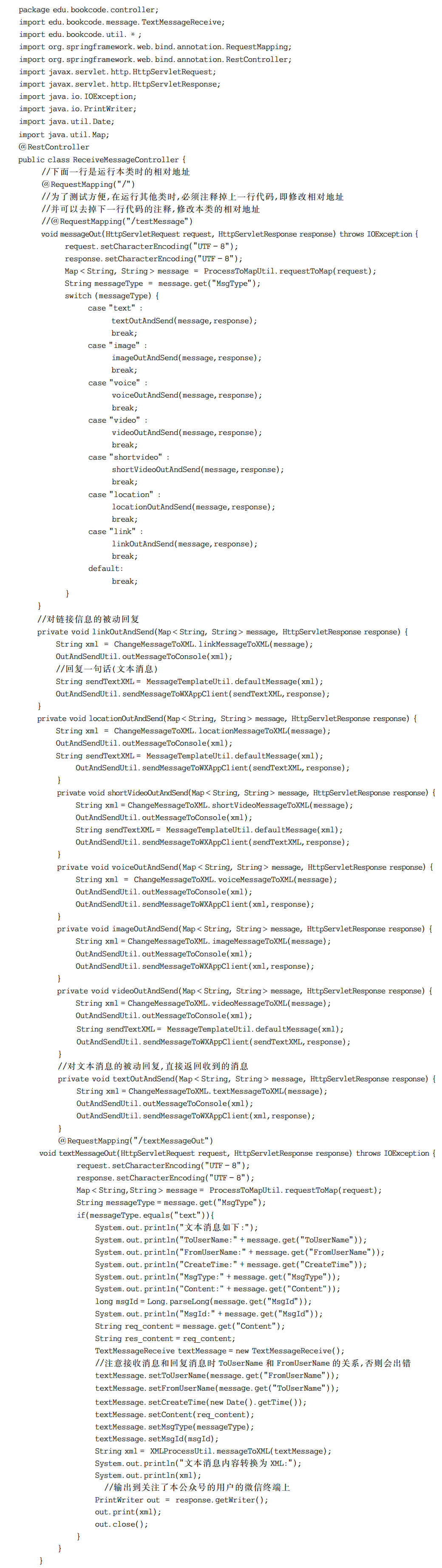 在包edu.bookcode.message中创建类TextMessageReceive,代码如例4-13所示。该类封装了文本消息的内容。可对照例4-12、例4-13和例4-1示例代码,加深对接收的文本消息XML数据规范的理解。本节后面的类也分别封装了不同类型的消息。