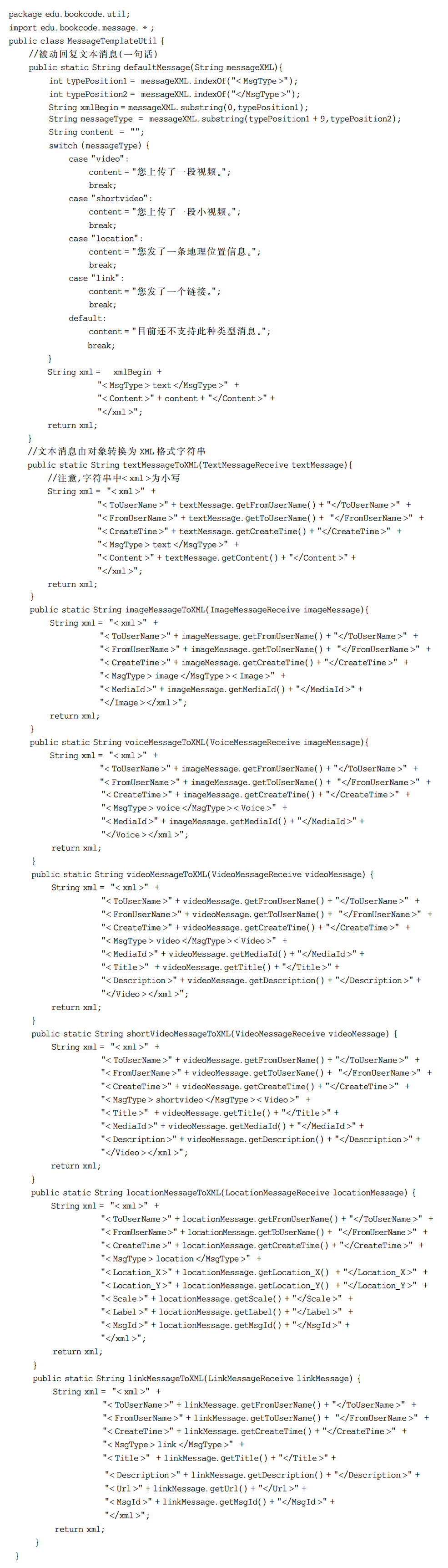 在包edu.bookcode.util中创建类MessageTemplateUtil,代码如例4-20所示。