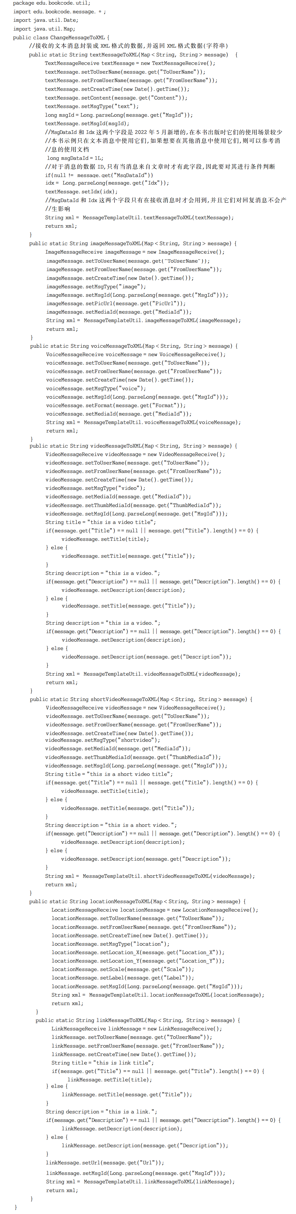 在包edu.bookcode.util中创建类ChangeMessageToXML,代码如例4-21所示。