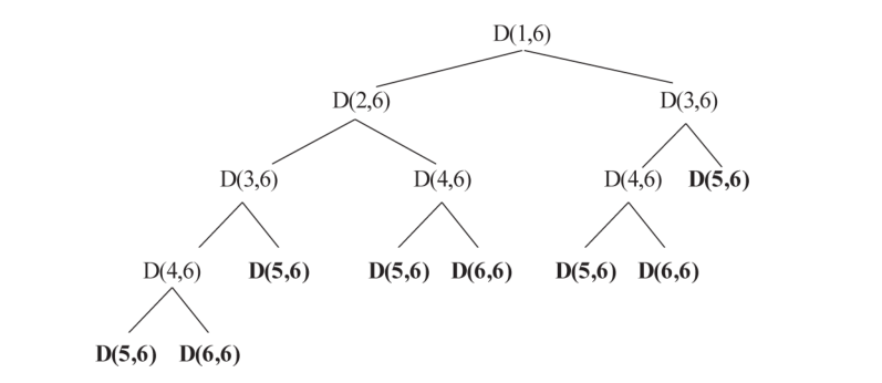 下面看一下这个递归算法的时间复杂度,图 4.1给出了 D(1,6)在递归中涉及的所有计算。