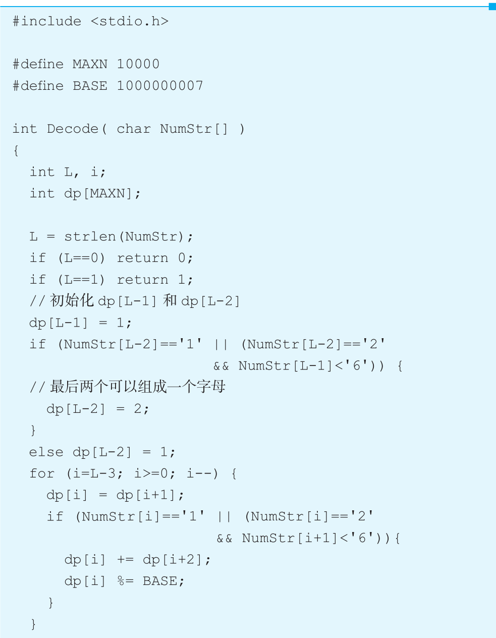一种直接的思路是从前向后递归推导。首先用 D(1,L)记录解码长度为 L的数字串的不同解决方案的个数,即从第 1个到第 L个数字的解码数。先看第 1个数字,如果是 1,或者是 2且第 2个数字小于 6,则前两个数字一定是某个字母的编码,同时第 1个字母肯定可以独立解码为另一个字母。此时可以先将第 1个字母独立解码,再继续解码剩下的数字串——这种解码的个数是 D(2,L);然后将前两个数字解码为另一个字母,再继续解码剩下的数字串 ——这种解码的个数是 D(3,L)。于是就有 D(1,L)=D(2,L)+ D(3,L),可以用一个非常简单的递归函数实现,终止条件为 D(L – 1,L)=1或 2,D(L,L)=1。