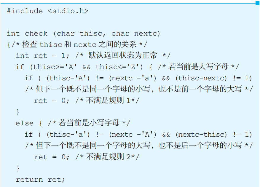 规则检查函数比较简单,它就是对两个规则的直接翻译。首先默认判断结果为正常,然后判断规则 1或 2是否有哪个没有满足,从而改变了状态。所以这里考查的是逆命题的逻辑实现是否正确,即当 thisc为大写字母时,规则 1的逆命题是“ nextc既不是 thisc的小写,也不是 thisc的前一个字母的大写”;当 thisc为小写字母时,规则 2的逆命题是“ nextc既不是 thisc的大写,也不是 thisc的后一个字母的小写”。