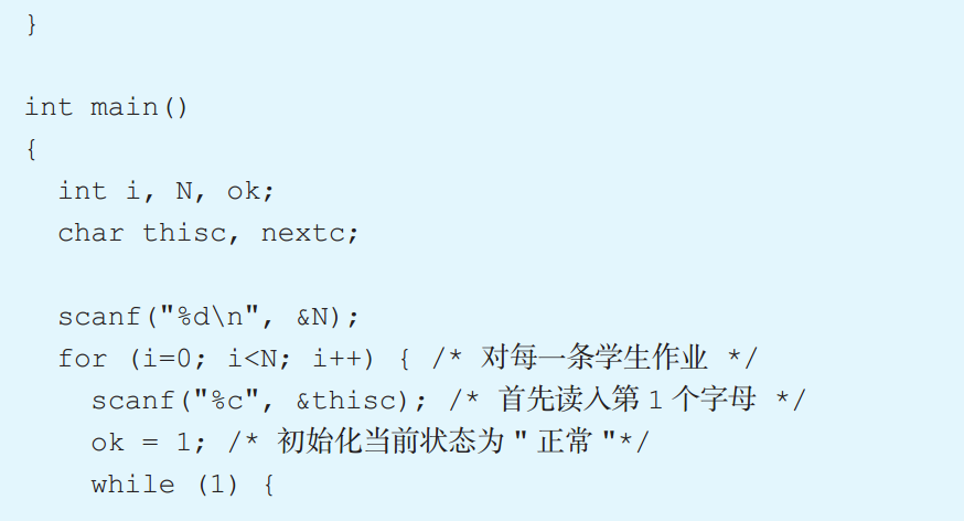 因为输入给出了学生作业的总条数 N,我们明确地知道循环次数,所以应该用一个 for循环处理每一条作业。而在处理每一条作业时,我们不知道学生作业字符串的长度,所以当使用循环处理每个字母时,使用 while循环比较合适。