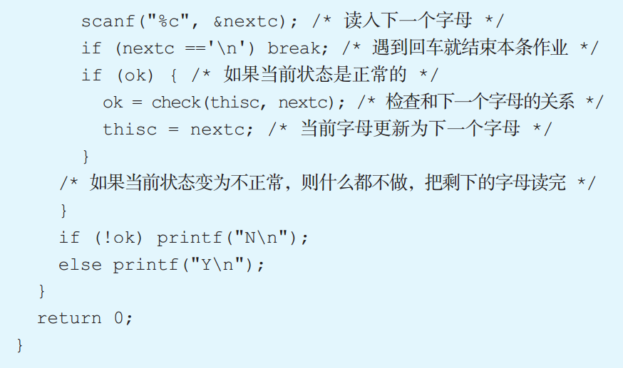 在处理每条作业时,只需要两个字符,即 thisc存储当前的字母, nextc存储 thisc的下一个字母。可以用一个函数 check(thisc, nextc)检查这两个字母是否满足规则。如果满足规则,则将 thisc更新为 nextc,然后继续读下一个 nextc。这里需要注意的是,一旦有一对字母不满足规则,那么整个作业就错了,但不能立刻跳出 while循环,而是应该继续把剩下的字母读完。